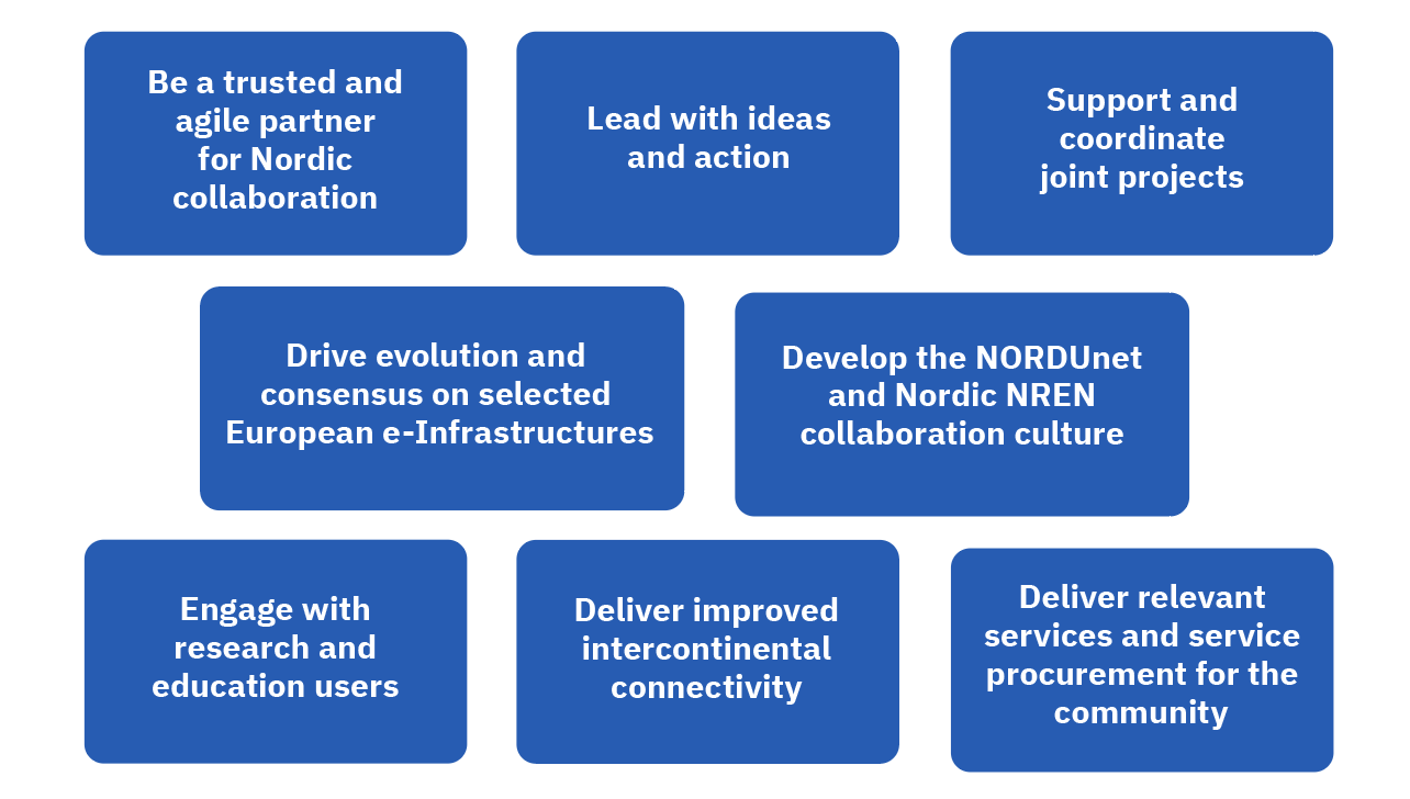 NORDUnet’s strategic focus is to be a trusted and agile partner with relevant competencies and skills, to have an organizational structure that supports the Nordic collaboration, and who understands the technology drivers in relevant sectors.